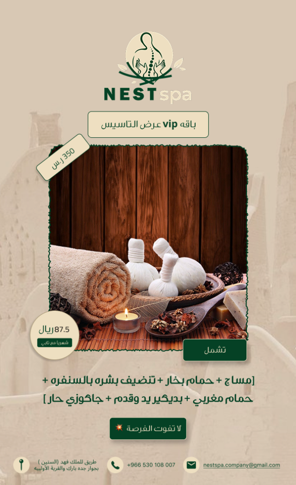 باقة vip من Nestspas تقدم لك تجربة استثنائية من العناية الفائقة. تشمل الباقة مساجًا مريحًا لتحسين الدورة الدموية، حمام بخار لتطهير الجسم، تنظيف البشرة باستخدام السنفره لإزالة الشوائب، وحمام مغربي فاخر يمنحك الراحة والانتعاش. إضافة إلى ذلك، تشمل الباقة بديكير لليد والقدم وجاكوزي حار لتهدئة العضلات. تم تصميم هذه الباقة بعناية لتمنحك تجربة رفاهية متكاملة.